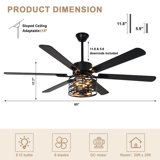 DC6501-BellaDepot 65" 8 Wooden Blades Black/Silver Finish Industrial Caged Reversible Ceiling Fan with Remote and 3 Lights, Large Size 6-speed Ceiling Fan