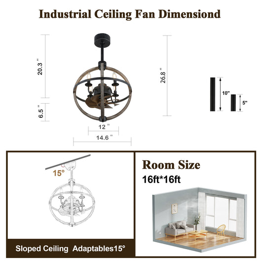BD1501-BellaDepot 14.6" Farmhouse Distressed Wood Caged Reversible Ceiling Fan with Remote and 4 Lights