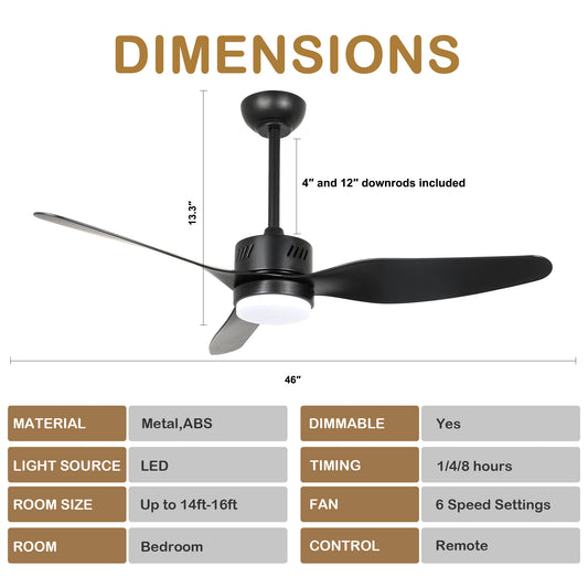 DC4602GED-BellaDepot 46" 3 Blades Simple Modern Reversible Ceiling Fan with Remote and LED Light Kit Included, 6-speed Dimmable Ceiling Fan