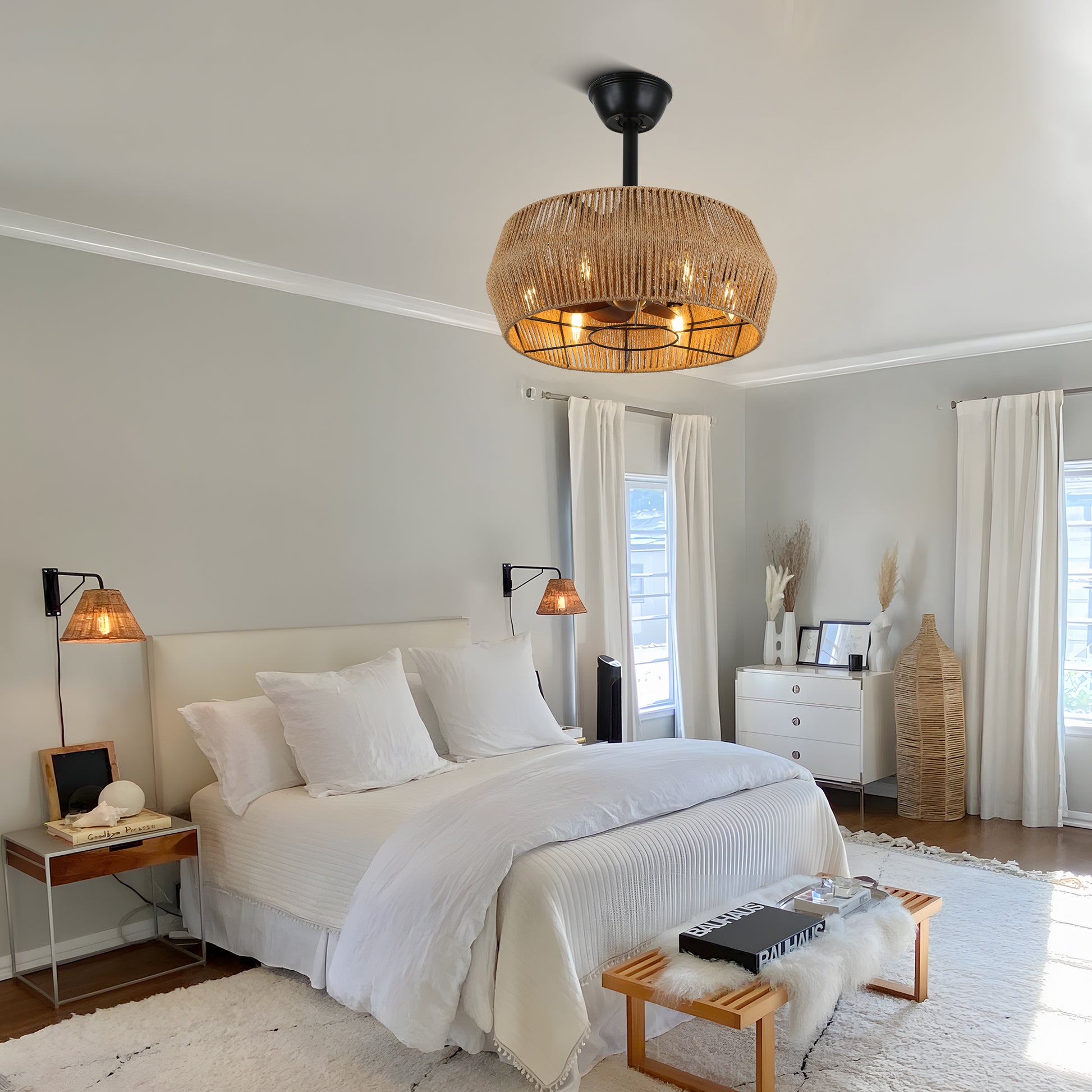 Introduce Bella Depot's rattan series. This is designed specifically for those who enjoy American countryside and retro style. Paired with ample and elegant ambient lighting, it is perfect for creating an atmosphere in the living room, bedroom, or dining area. We believe that low price and high energy efficiency are crucial, and the core of the fan is a powerful AC motor designed for silent operation and excellent energy efficiency (35W). The reversible blade function allows you to switch between downward suction cooling in summer and upward suction heat redistribution in winter, making it a year-round solution for climate management.