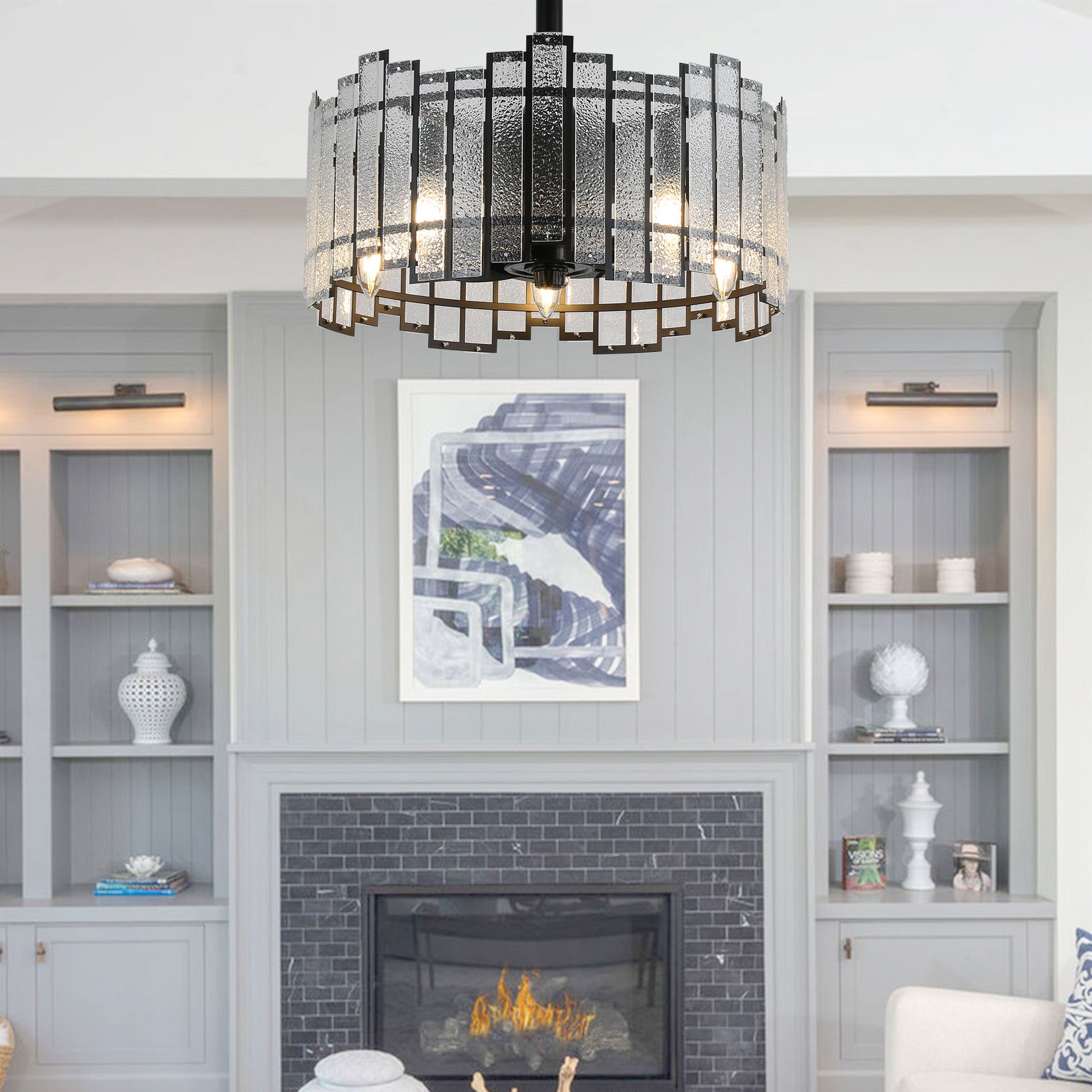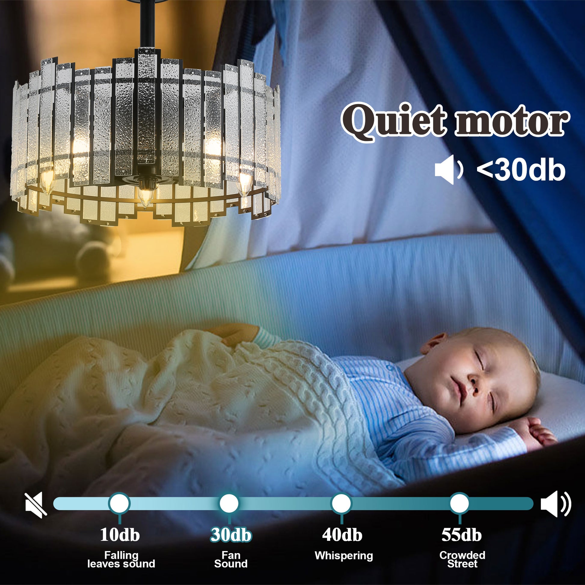 Explore the soft moonlight like brightness and water like water glass casing of ceiling fans designed with Luna series. The advanced 6-speed DC motor delivers robust airflow up to 1050 RPM for exceptional cooling power, all while operating with whisper-quiet efficiency and remarkable energy savings. The fixture accommodates five E12 candelabra base bulbs (not included). The reversible blade function provides optimal airflow for every season. Includes two downrods (4" and 8") to accommodate various ceiling heights, from standard to high ceilings. Compatible with sloped ceilings up to 15 degrees for flexible installation throughout your home.