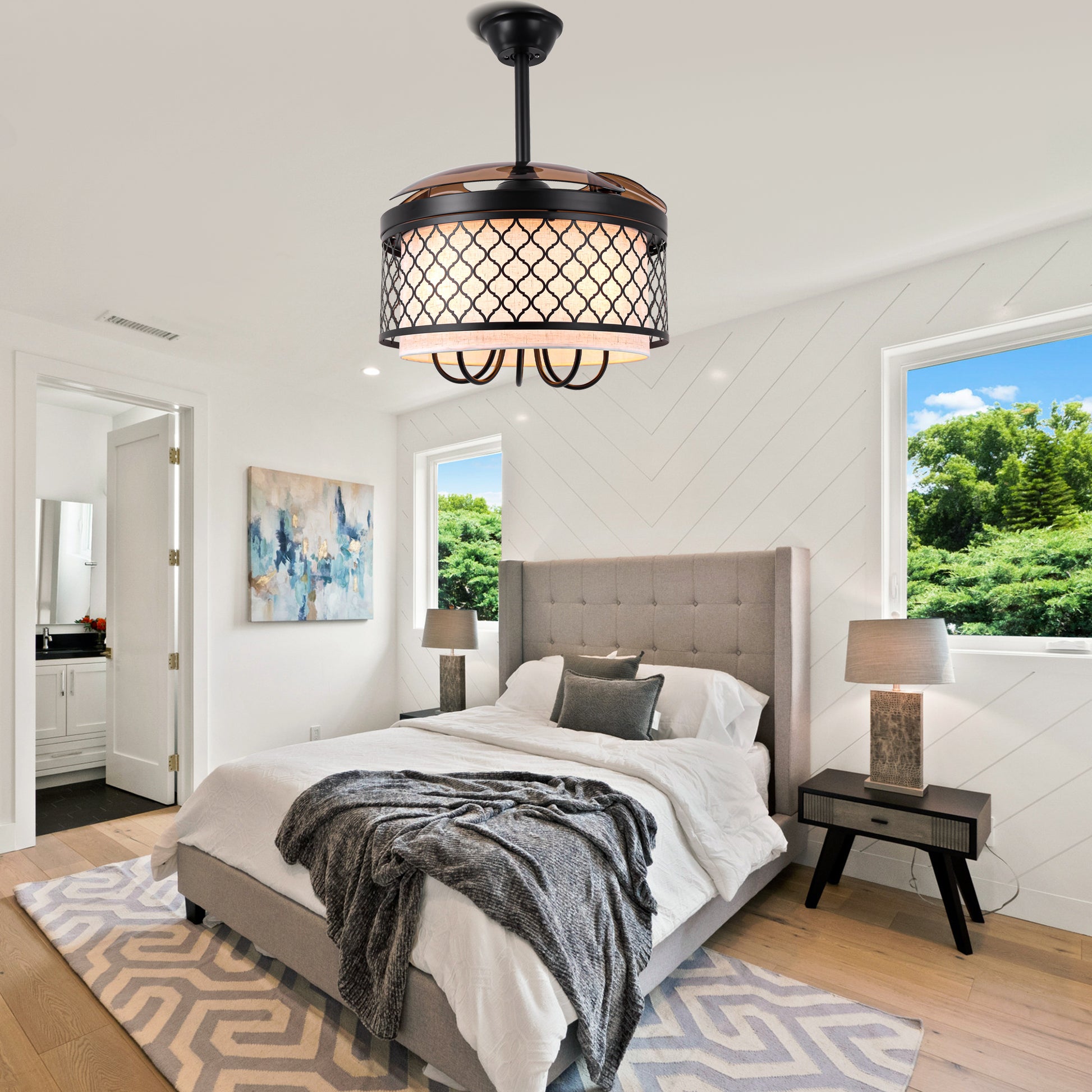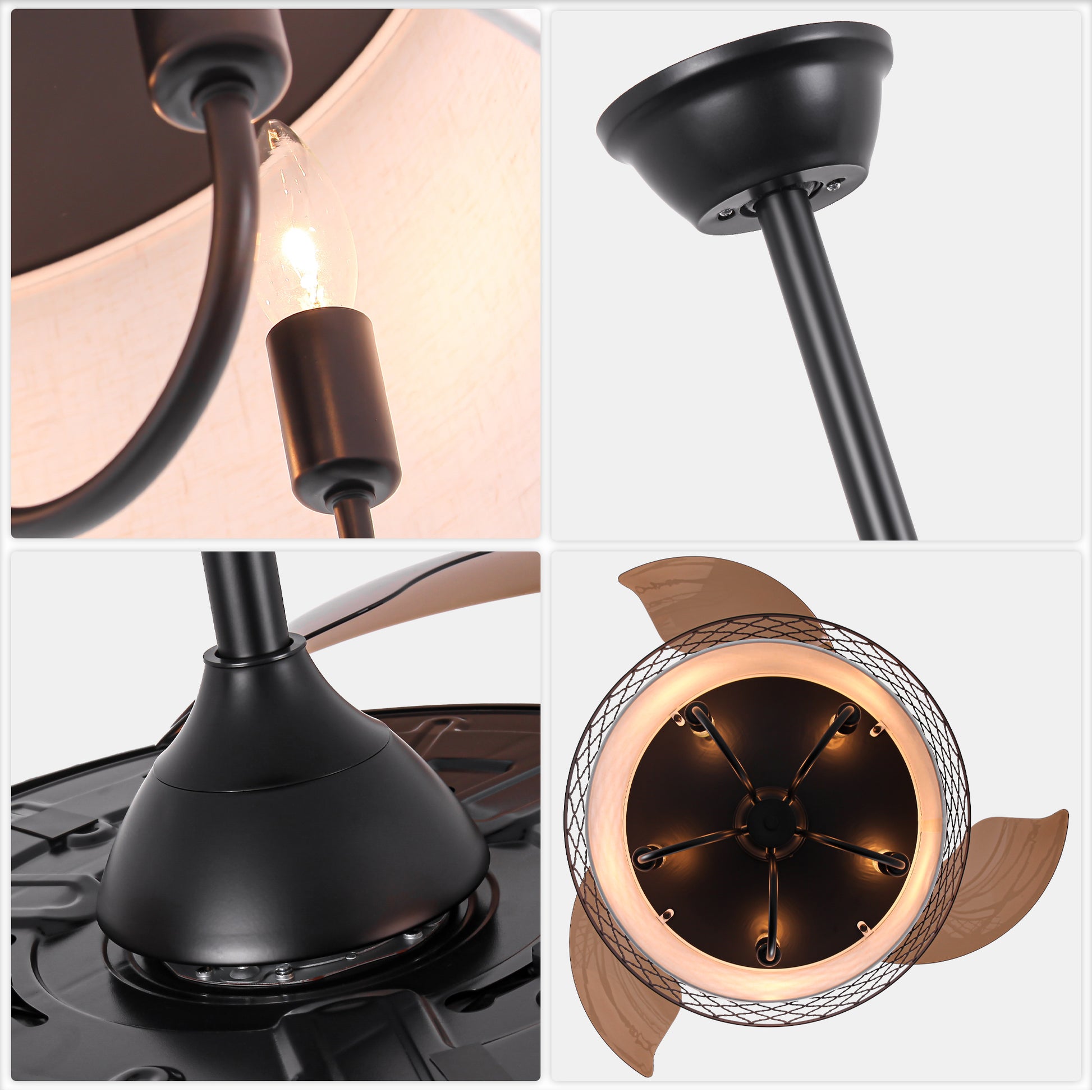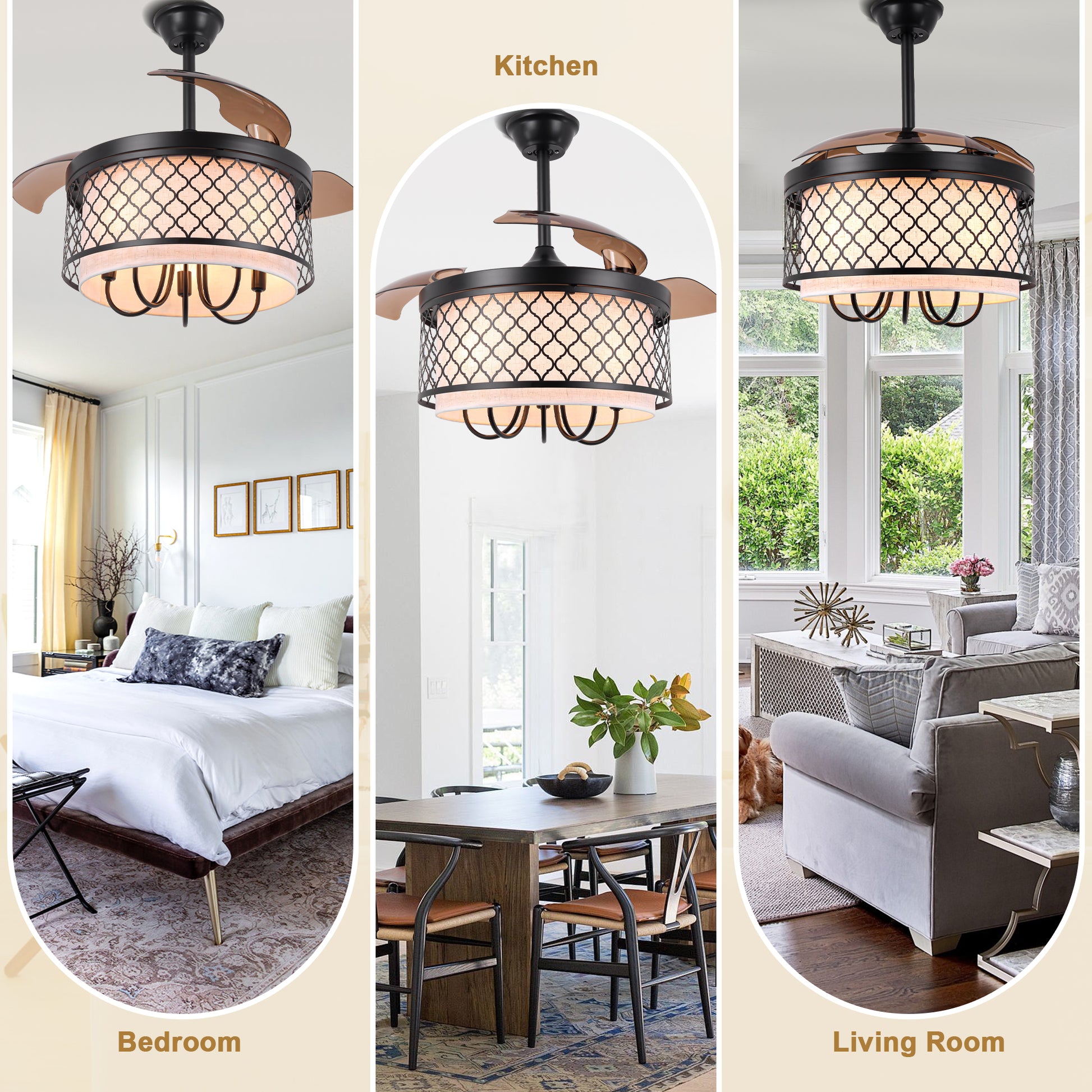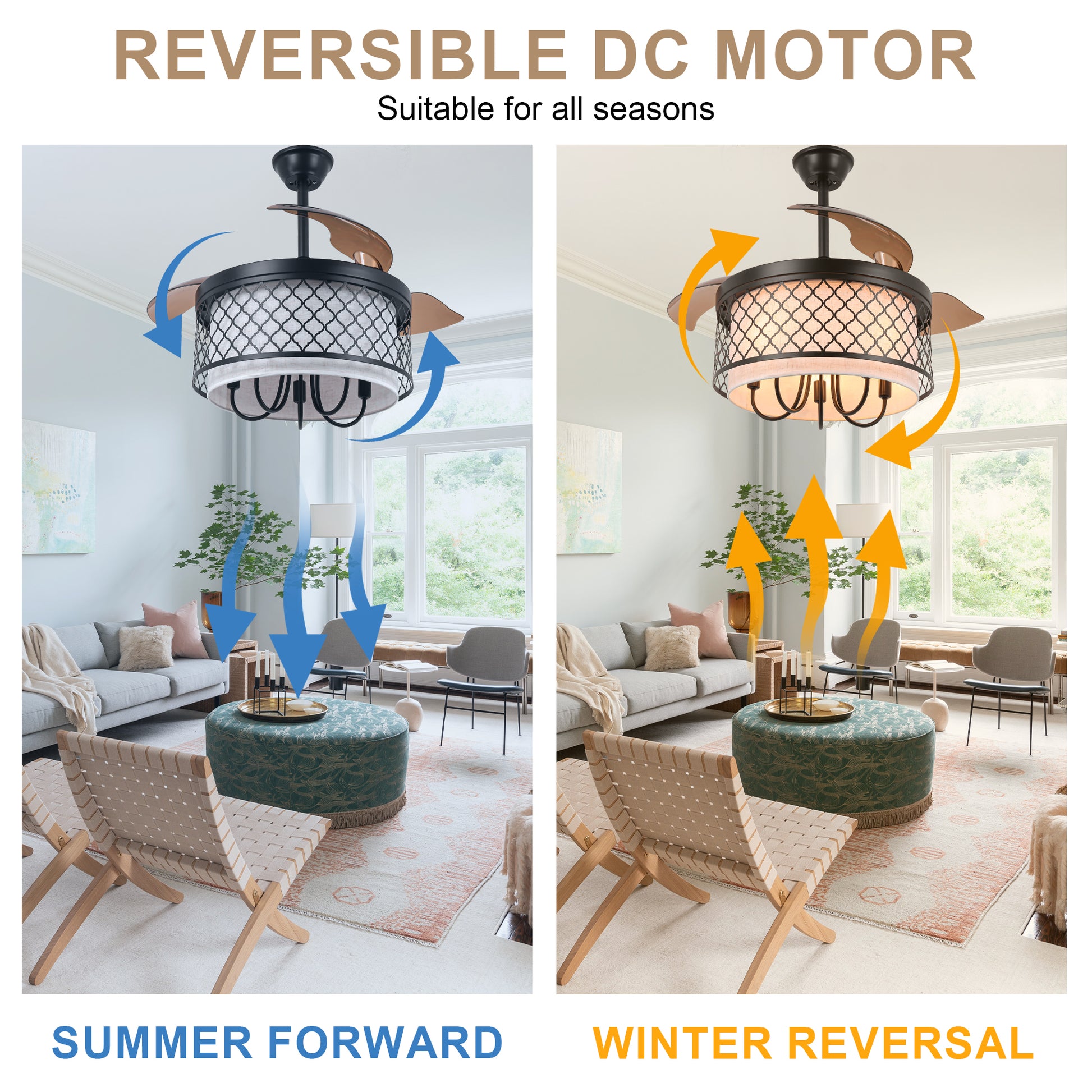 BellaDepot's 42-inch industrial retractable blade fabric ceiling fan light is a true vintage masterpiece. Featuring transparent brown blades, its earthy palette of beige and brown tones complements the black wrought-iron shade, blending gentle elegance with dependable charm. The candlestick-inspired lamp base adds an extra retro touch, transporting you back in time. BellaDepot's premium DC motor operates at under 35 decibels. During daily life and relaxation, you'll feel a gentle breeze—and may barely notice it's running. Notably, our motor features reversible rotation technology, making it a truly year-round fan. Simply press the remote to reverse blade direction, effectively pushing warm air trapped near the ceiling downward during winter. The distance between us and an ideal life may lie in this one redefined space above our heads.