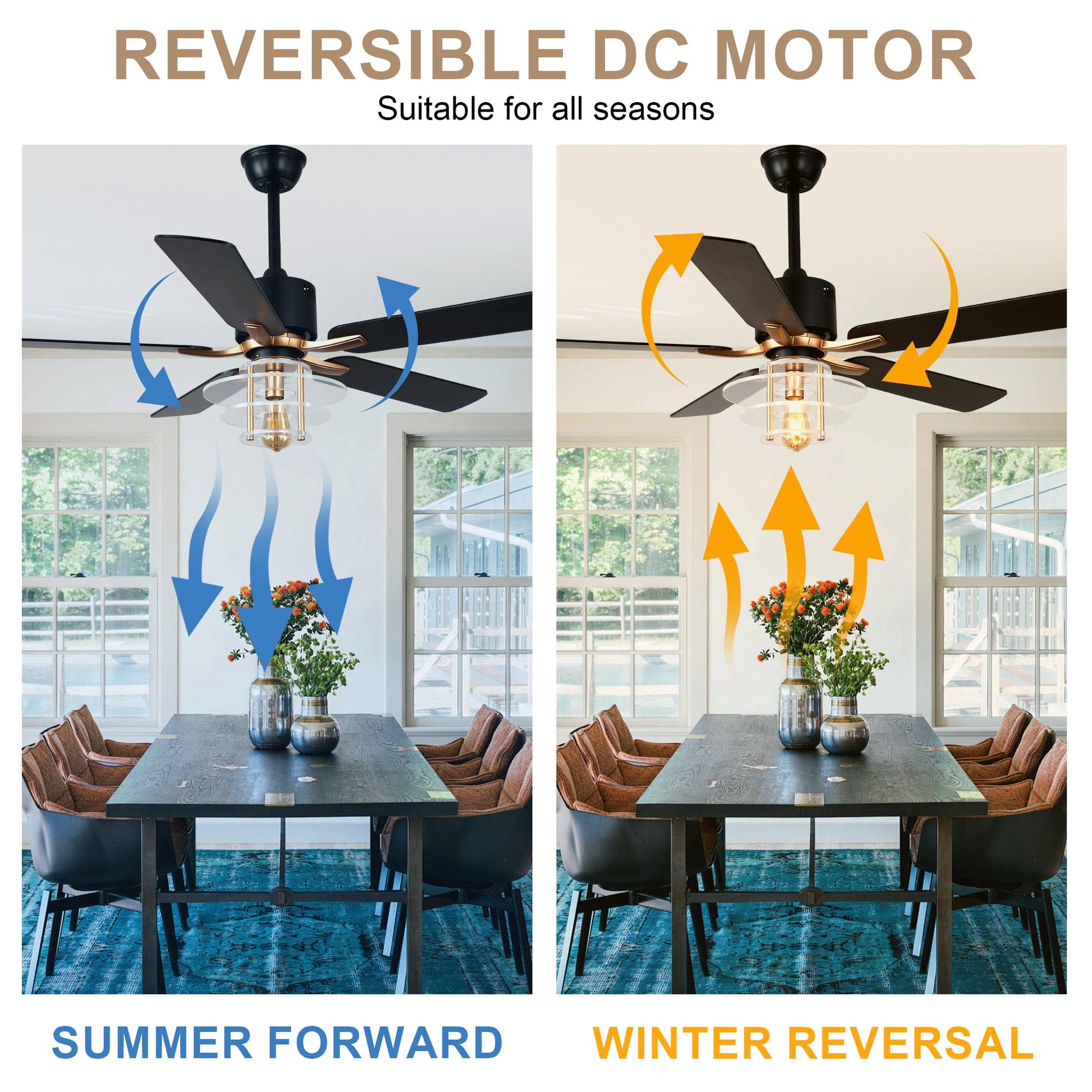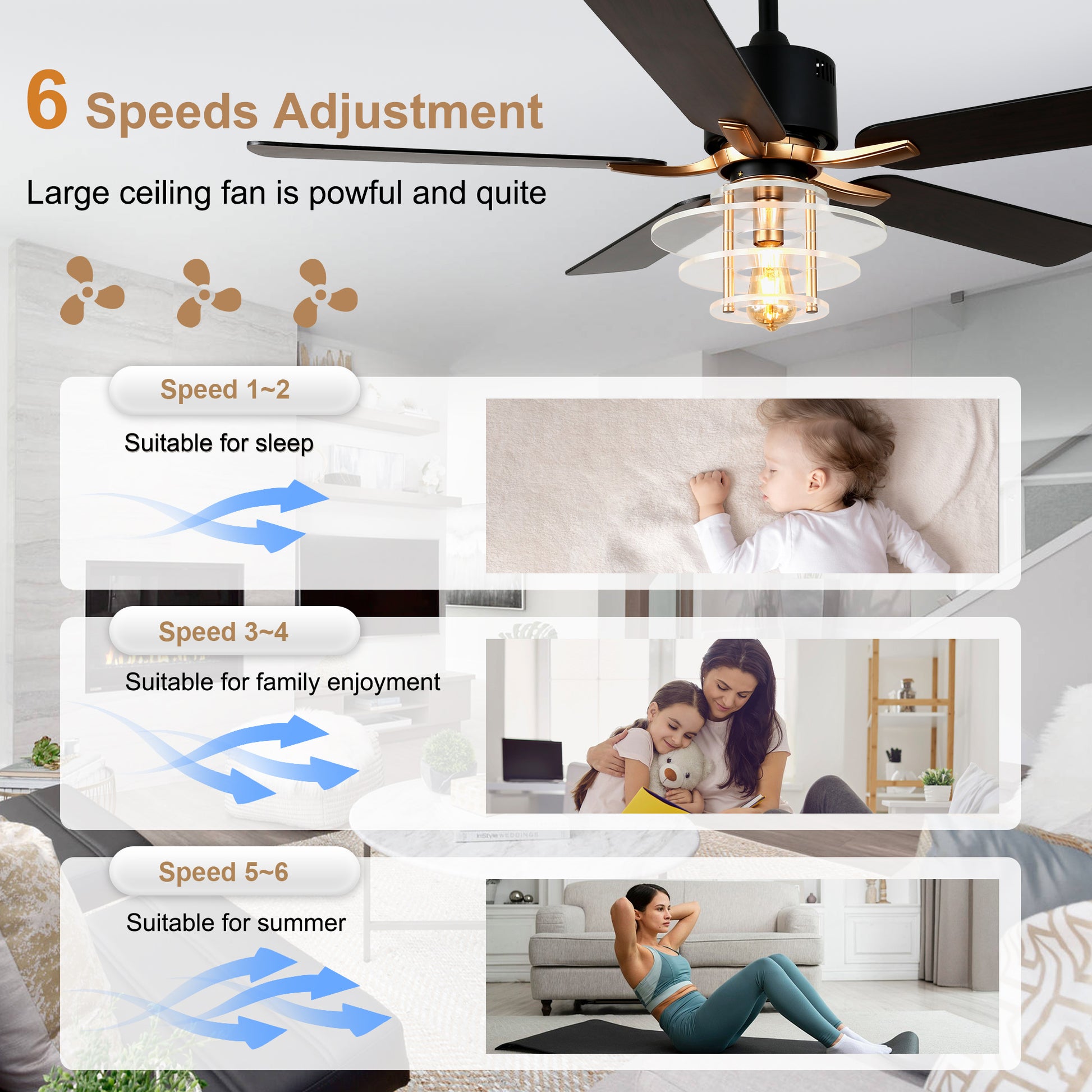 Our modern simple design industrial style ceiling fans are sure to become one of your favorite home decor items! This ceiling fan combines a fan and lighting fixtures, with powerful functions and beautiful appearance. With a diameter of 51.97 inches, this ceiling fan is perfect for large bedrooms, dining rooms, living rooms, etc. We include a remote control in our product that allows you to control all product functions. Fan function: including six speed adjustments, fan blade reversal, and timer function. Adopting the latest DC motor, it saves energy costs, provides strong airflow, and maintains low noise levels. Forward rotation reduces temperature, while reverse rotation reduces temperature difference. The timer function provides convenience and peace of mind, so you don't have to worry about turning off the fan when you wake up after sleeping. Lighting function: E26 bulbs are required to provide lighting, but bulbs are not included. The separate control of fans and lights ensures versatility, allowing you to use them as independent light sources or fans. This ceiling fan is suitable for flat or sloping ceilings (ceilings with an inclination of less than 15 degrees). Including 5-inch and 10-inch downrods to accommodate rooms of different heights.