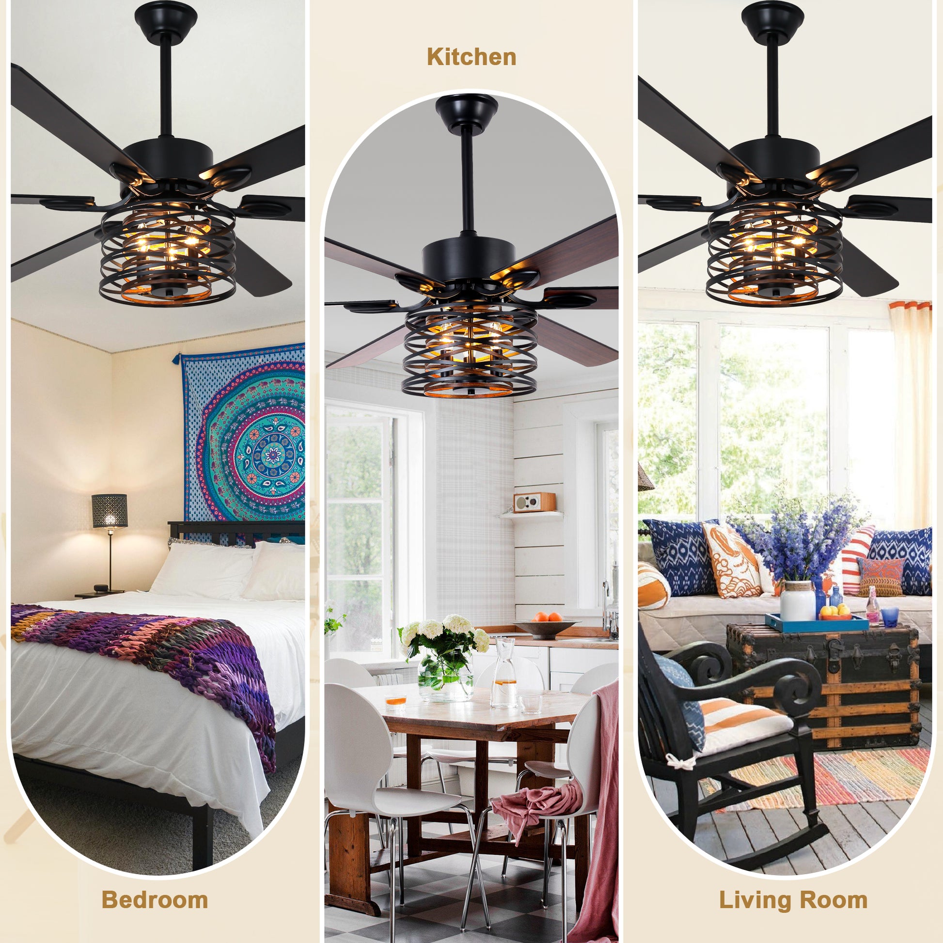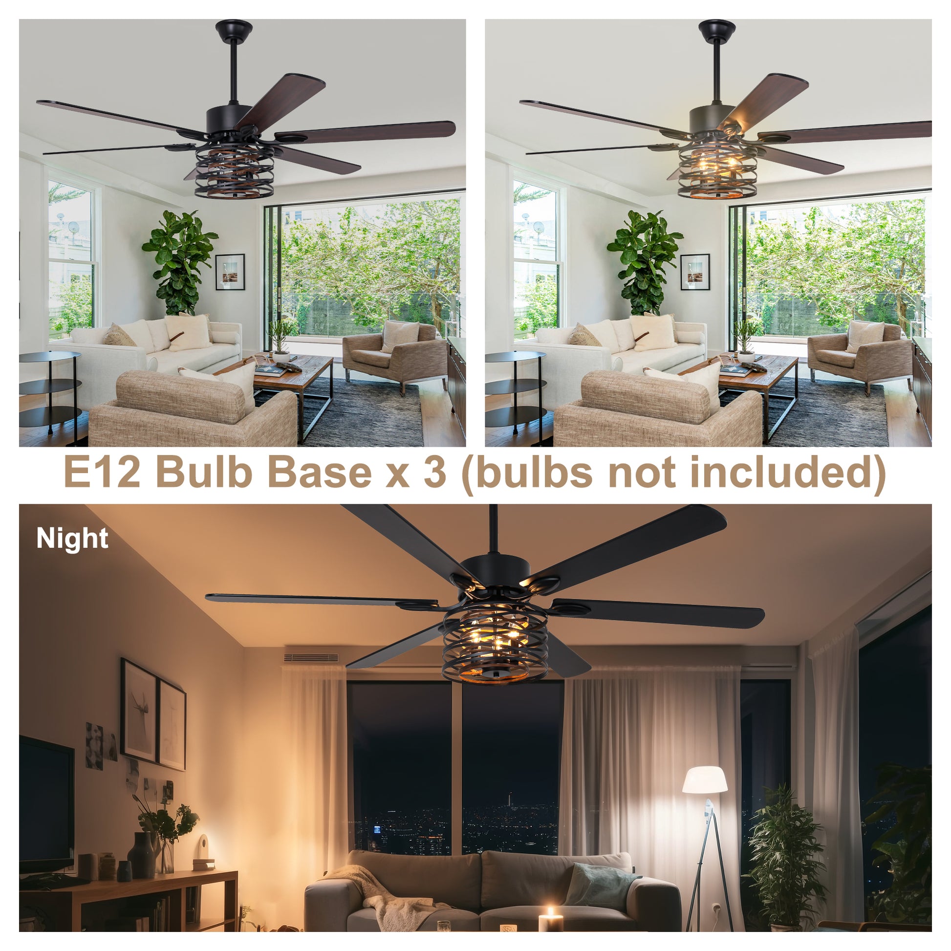 Our 65 inch diameter farmhouse industrial ceiling fans are sure to become one of your favorite home decor items! This ceiling fan combines a fan and lighting fixtures, with powerful functions and beautiful appearance. With a diameter of 65 inches, this ceiling fan is perfect for large living rooms. We include a remote control in our product that allows you to control all product functions. Fan function: including six speed adjustments, fan blade reversal, and timer function. Adopting the latest DC motor, it saves energy costs, provides strong airflow, and maintains low noise levels. Forward rotation reduces temperature, while reverse rotation reduces temperature difference. The timer function provides convenience and peace of mind, so you don't have to worry about turning off the fan when you wake up after sleeping. Lighting function: three E12 bulbs are required to provide lighting, but bulbs are not included. The separate control of fans and lights ensures versatility, allowing you to use them as independent light sources or fans. This ceiling fan is suitable for flat or sloping ceilings (ceilings with an inclination of less than 15 degrees). Including 6-inch and 12-inch downrods to accommodate rooms of different heights.
