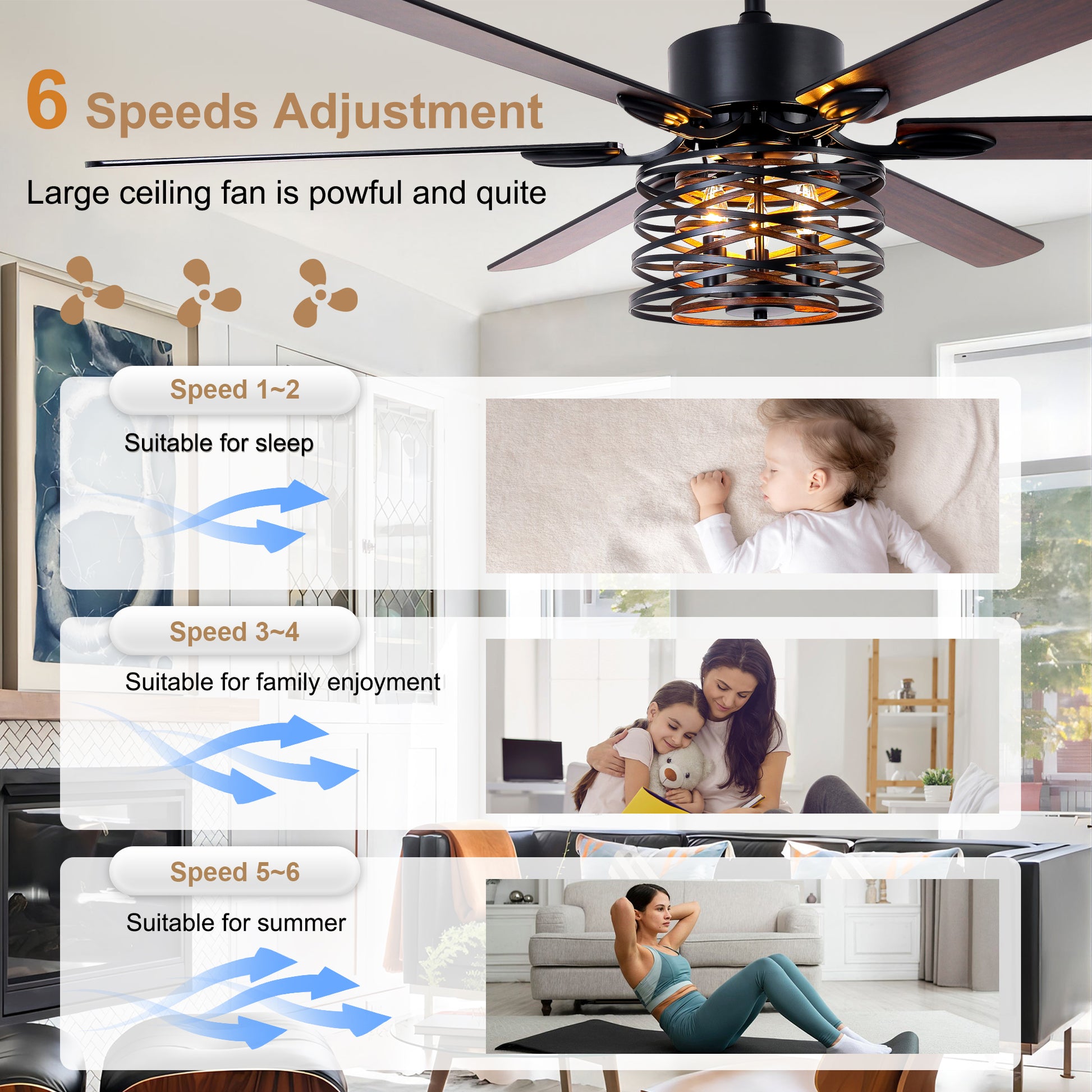 DC6507-BellaDepot 65" Farmhouse Industrial Brown Large Size Ceiling Fan with Remote Control, Silent Motor 6 Speeds Straight Leaf Fan with 3 Lights