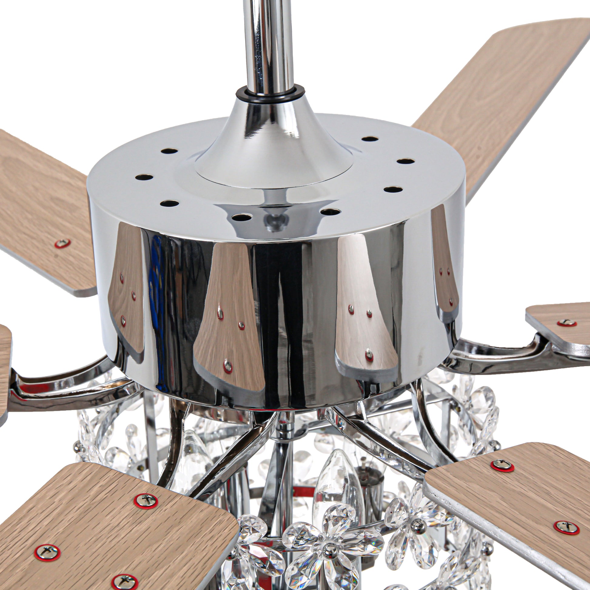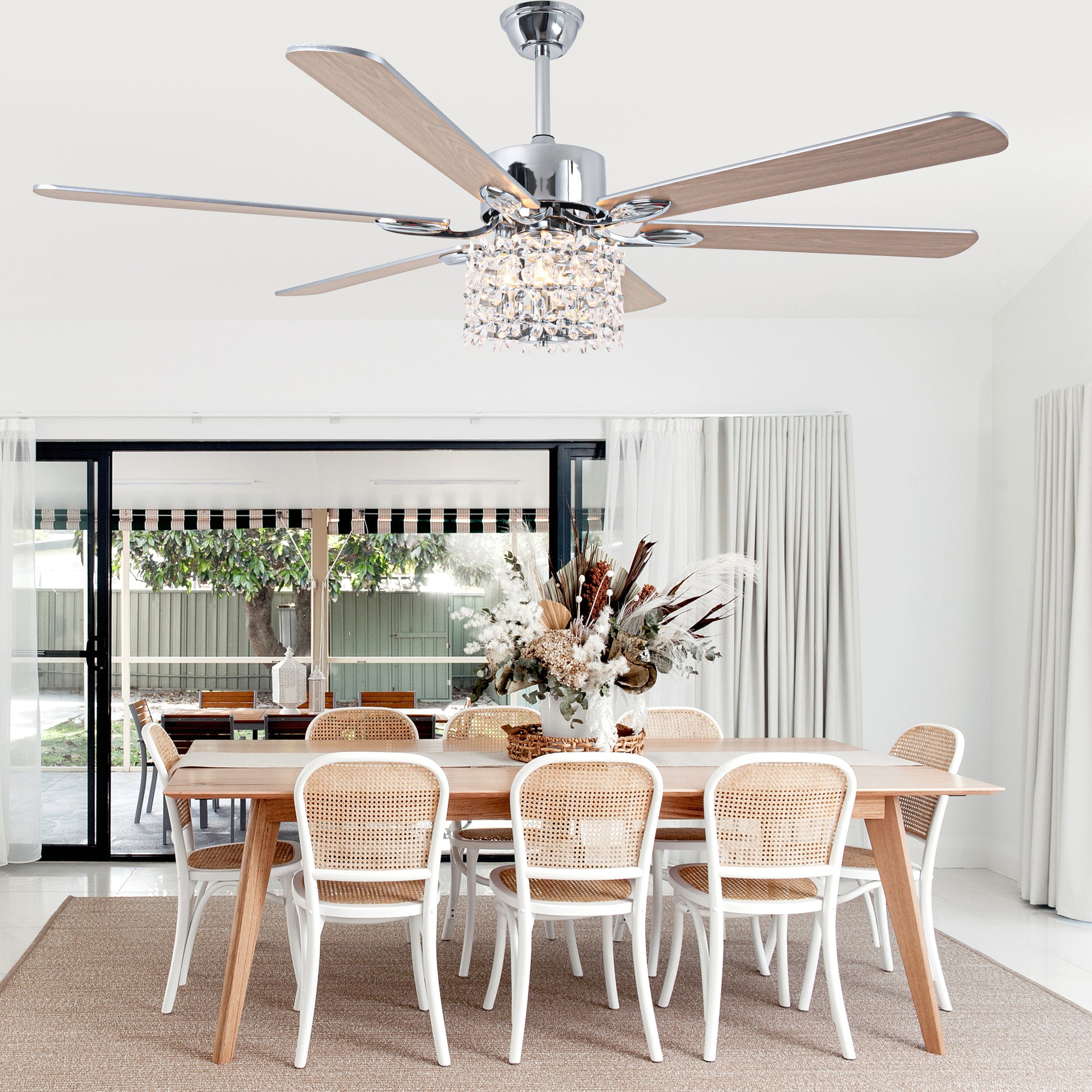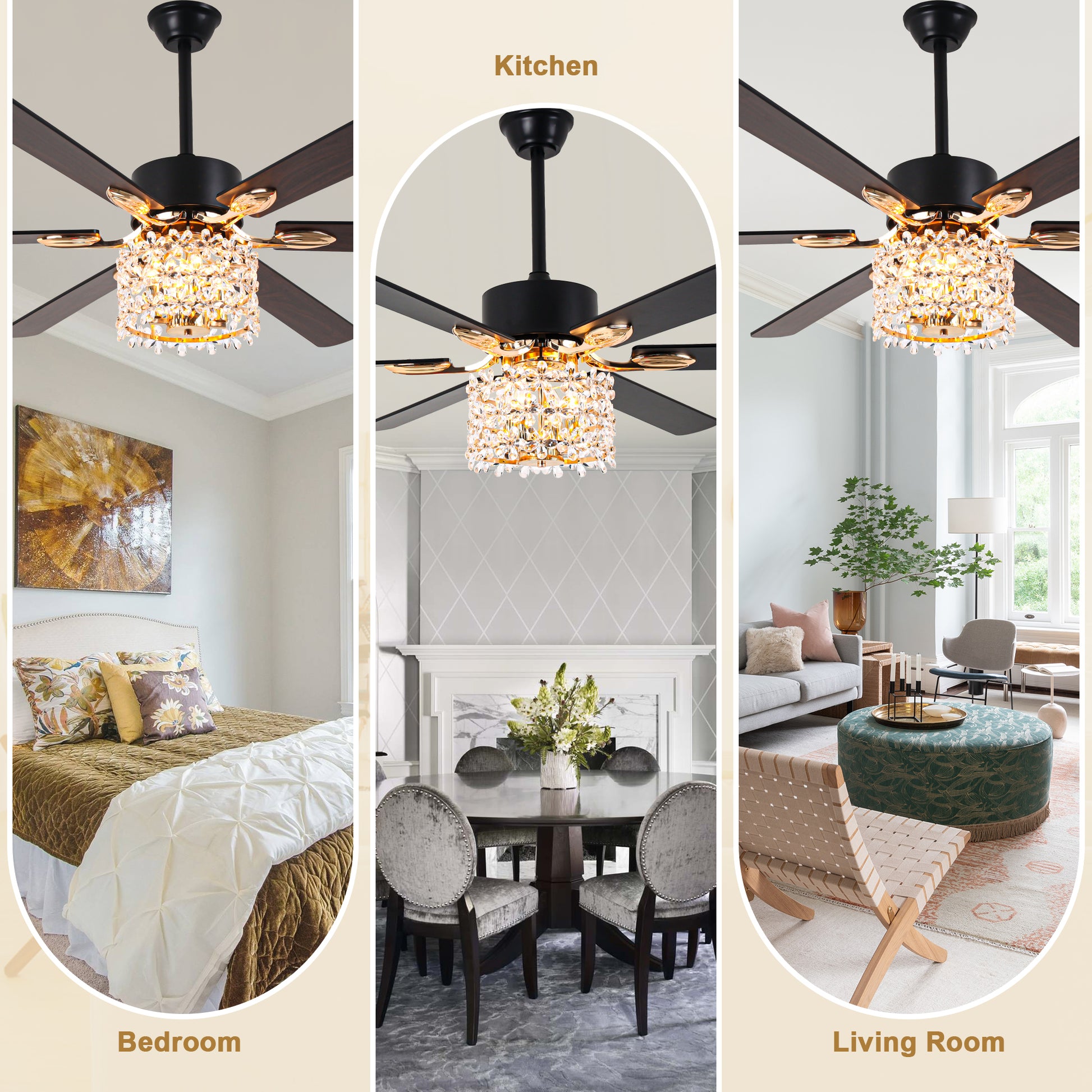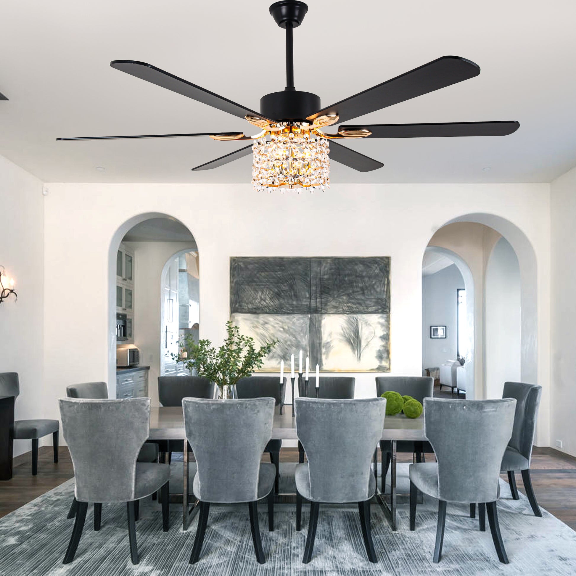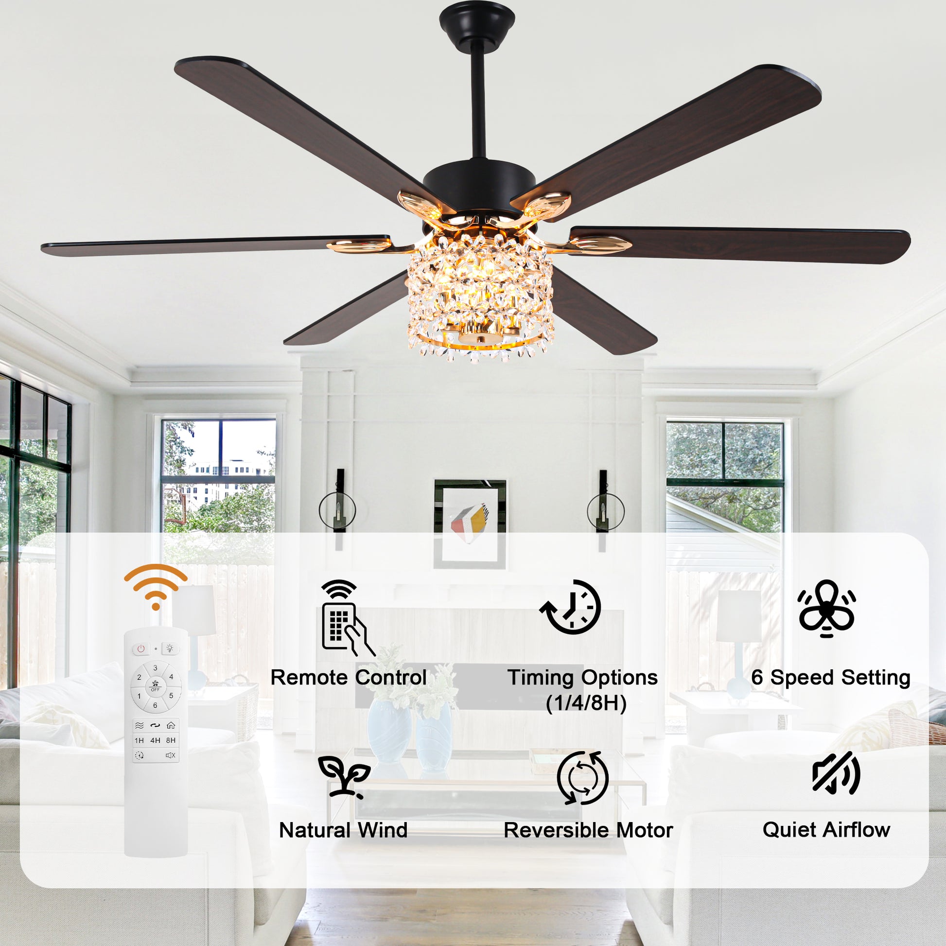 - Material: Iron + crystal + plywood fan blades
