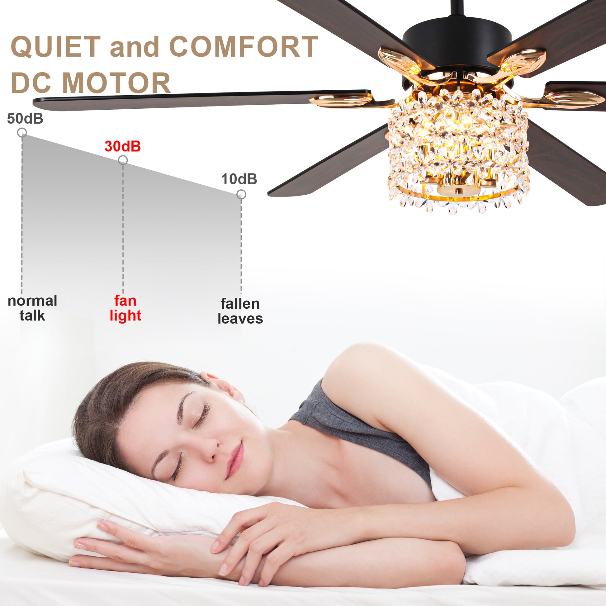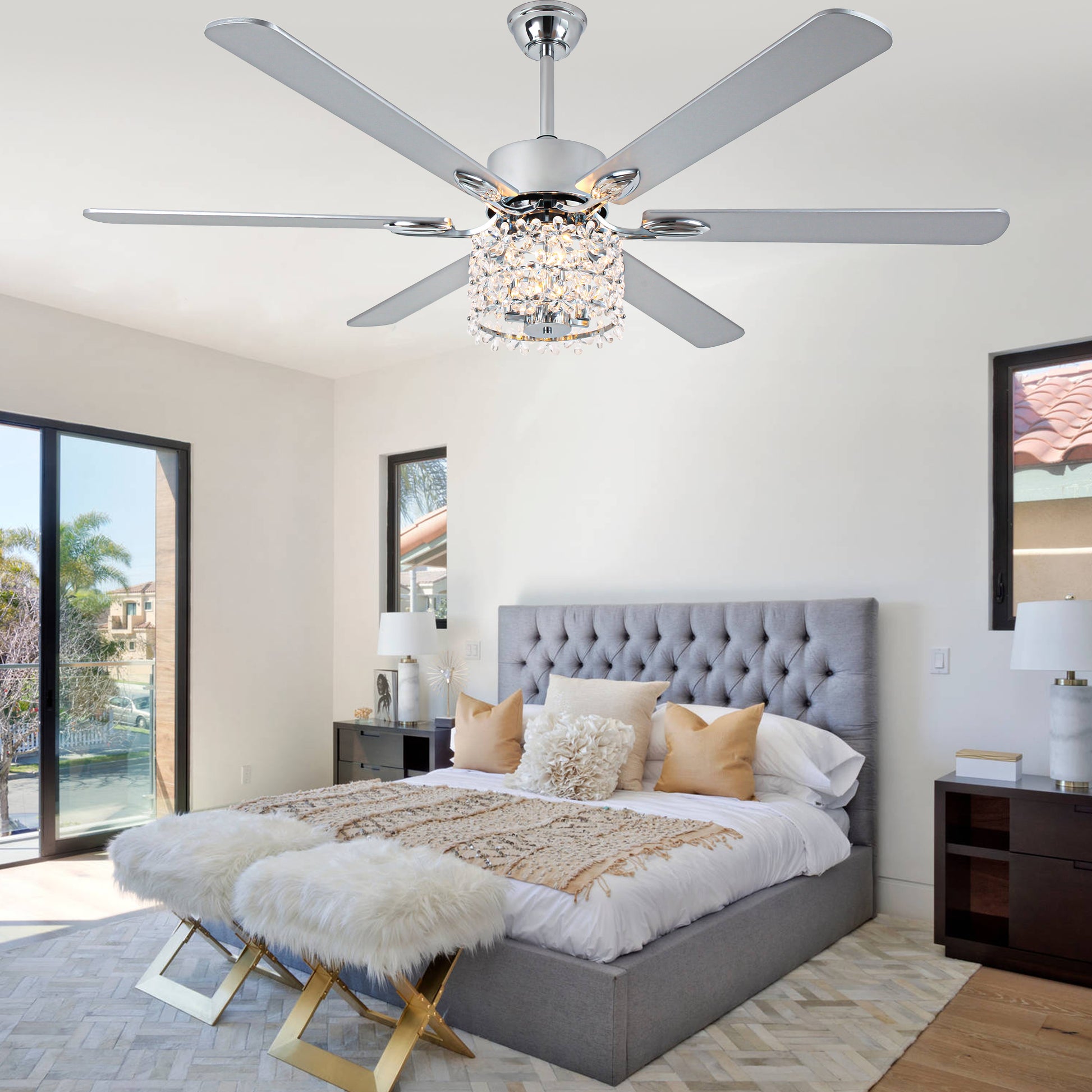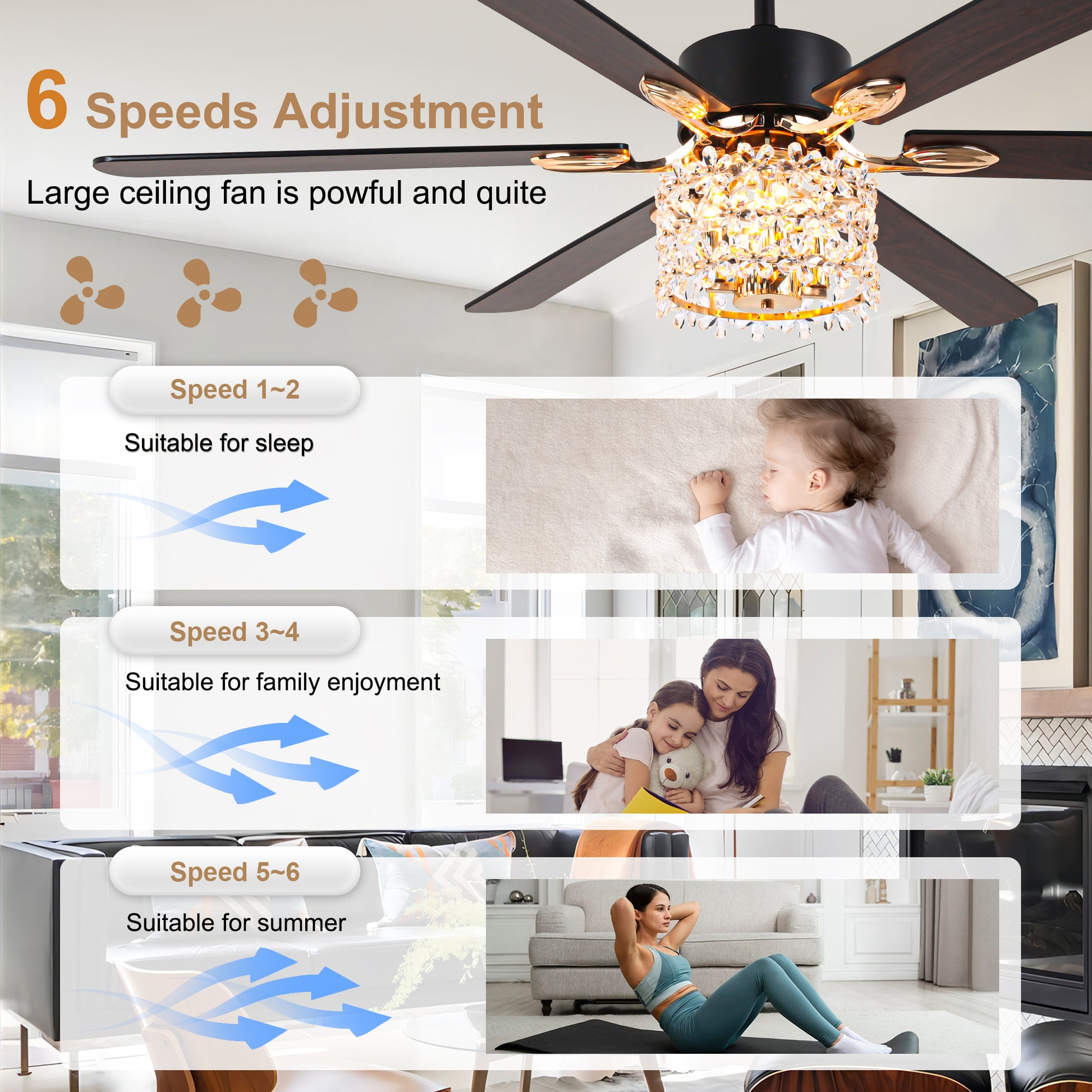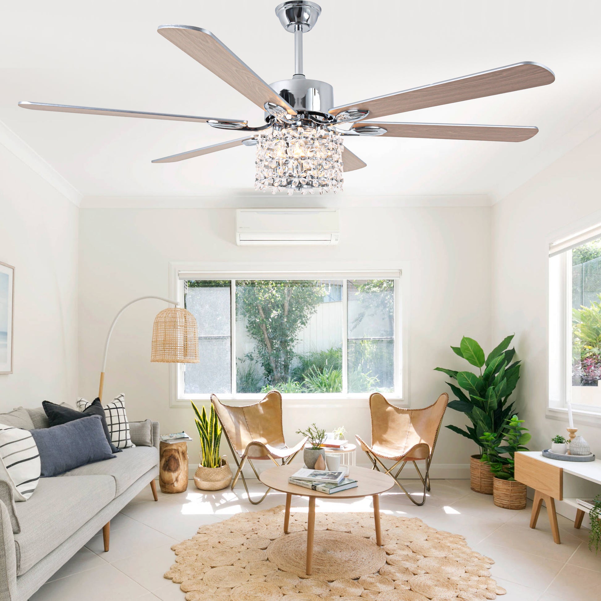 - Material: Iron + crystal + plywood fan blades