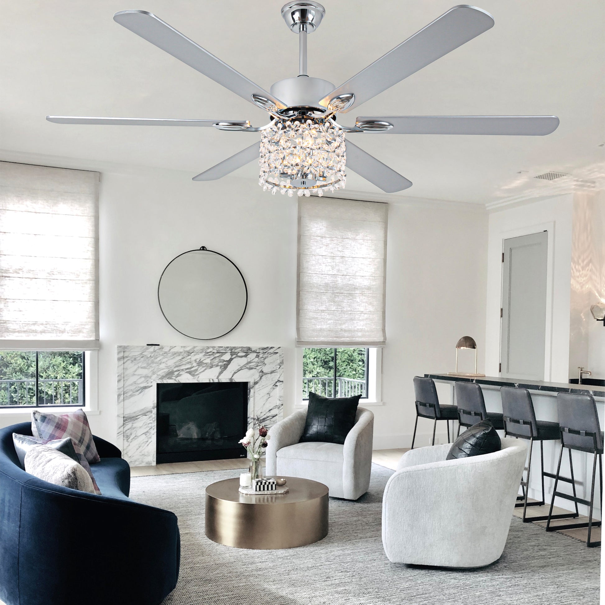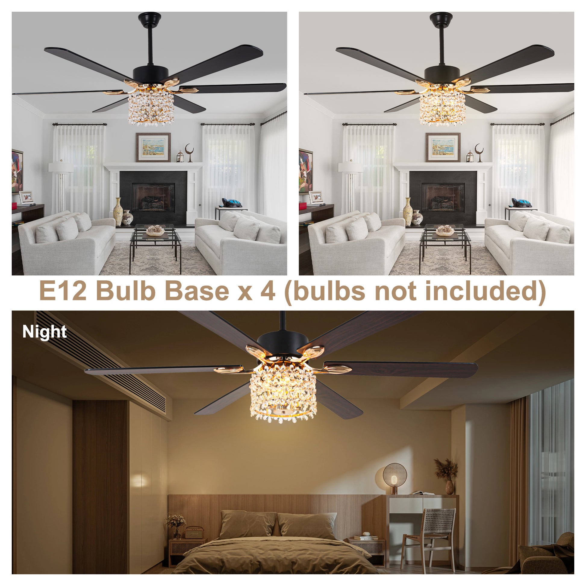 Indulge in the extraordinary with the Crystal Bloom Ceiling Fan, a masterpiece where luxury meets artistry. This massive object features an exquisite crystal flower caged design that captivates from every angle, creating a dazzling visual spectacle. Despite its ornate appearance, this fan delivers exceptional performance with a 6-speed DC motor designed for whisper-quiet operation. The fixture accommodates three E12 candelabra base bulbs (not included). The reversible blade function offers dual-season functionality. Summer mode provides refreshing cooling breezes, while winter mode efficiently circulates warm air, maintaining ideal temperatures and improving energy efficiency throughout the year. The included timer function provides convenience, allowing you to program the fan to automatically shut off after a preset period, perfect for energy conservation and effortless operation. Includes two downrods (6" and 12") to accommodate various ceiling heights in spacious rooms. Compatible with sloped ceilings up to 15 degrees.The perfect functionality and impeccable appearance of the ceiling fan will be your best choice for choosing furniture.