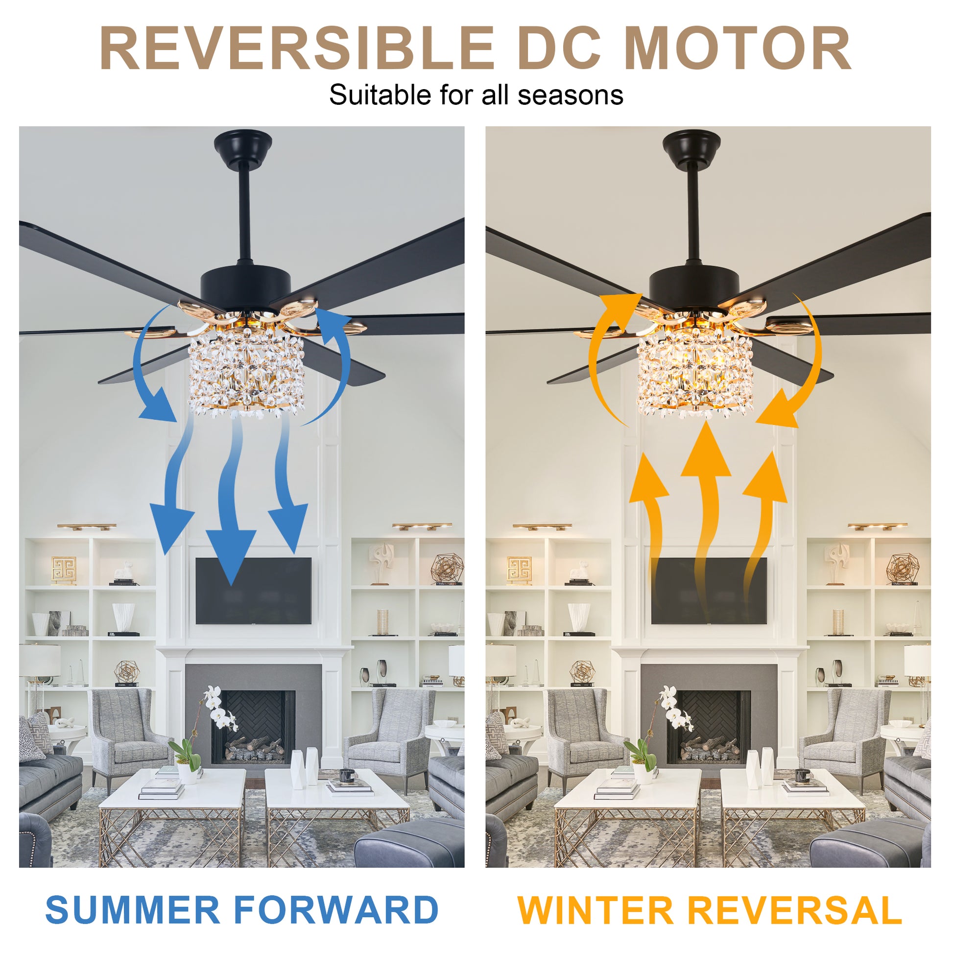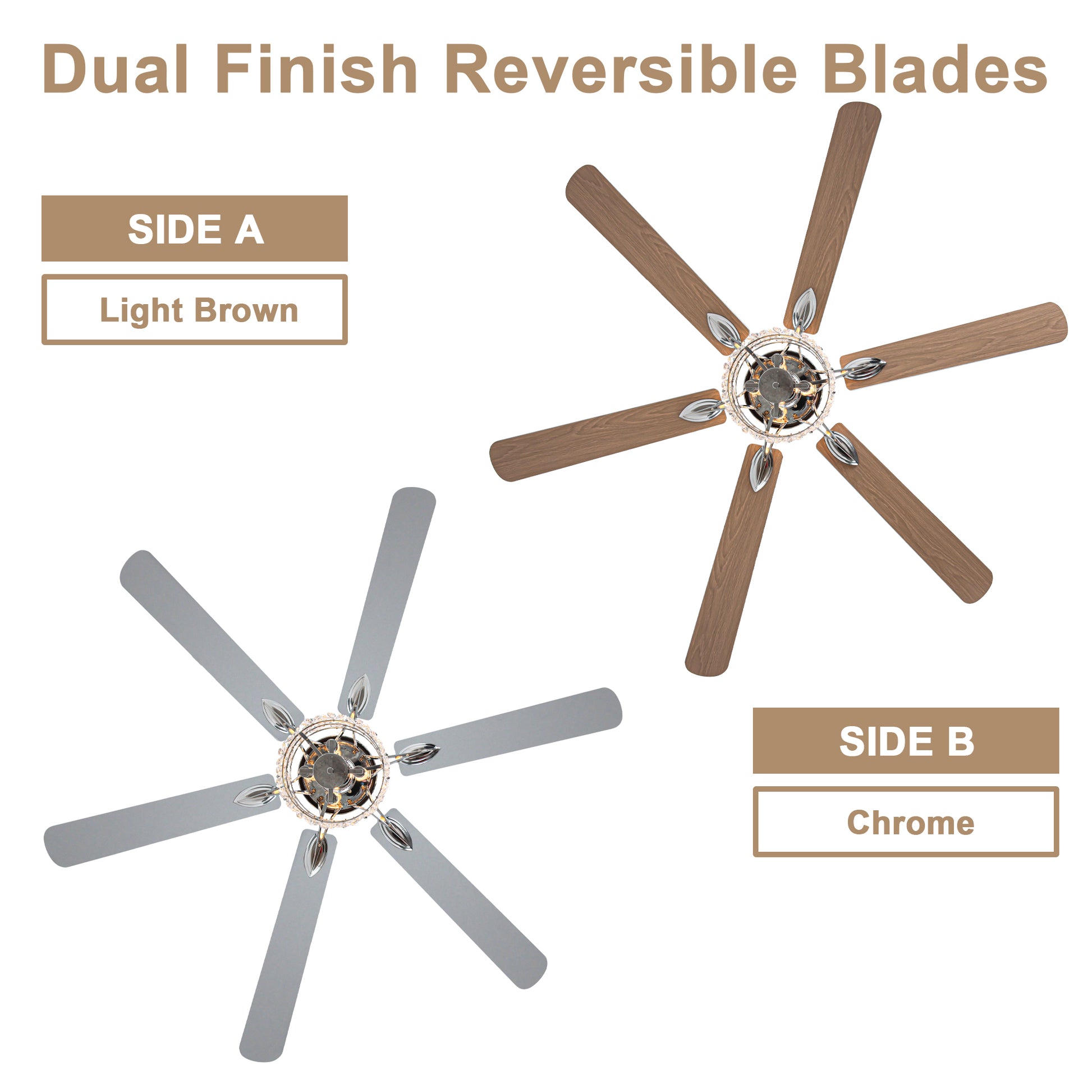 - (Fan blade color: Black - front: black, reverse: wood grain; Chrome - front: silver, reverse: wood grain)