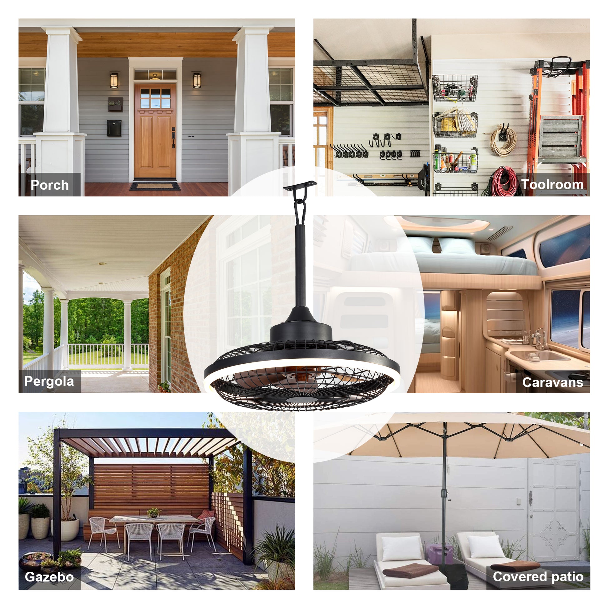 BellaDepot's outdoor cage style ceiling fans are carefully designed to be suitable for various outdoor occasions such as terraces, courtyards, and camping. It have dual functions of lighting and ventilation, combining practicality and aesthetics. The portable design makes it easy to carry or install flexibly, whether hanging inside a tent or under a tree, it can bring you coolness and brightness. The fan runs quietly and efficiently, and the LED lights are soft and energy-saving, making it an ideal choice for improving outdoor living comfort.