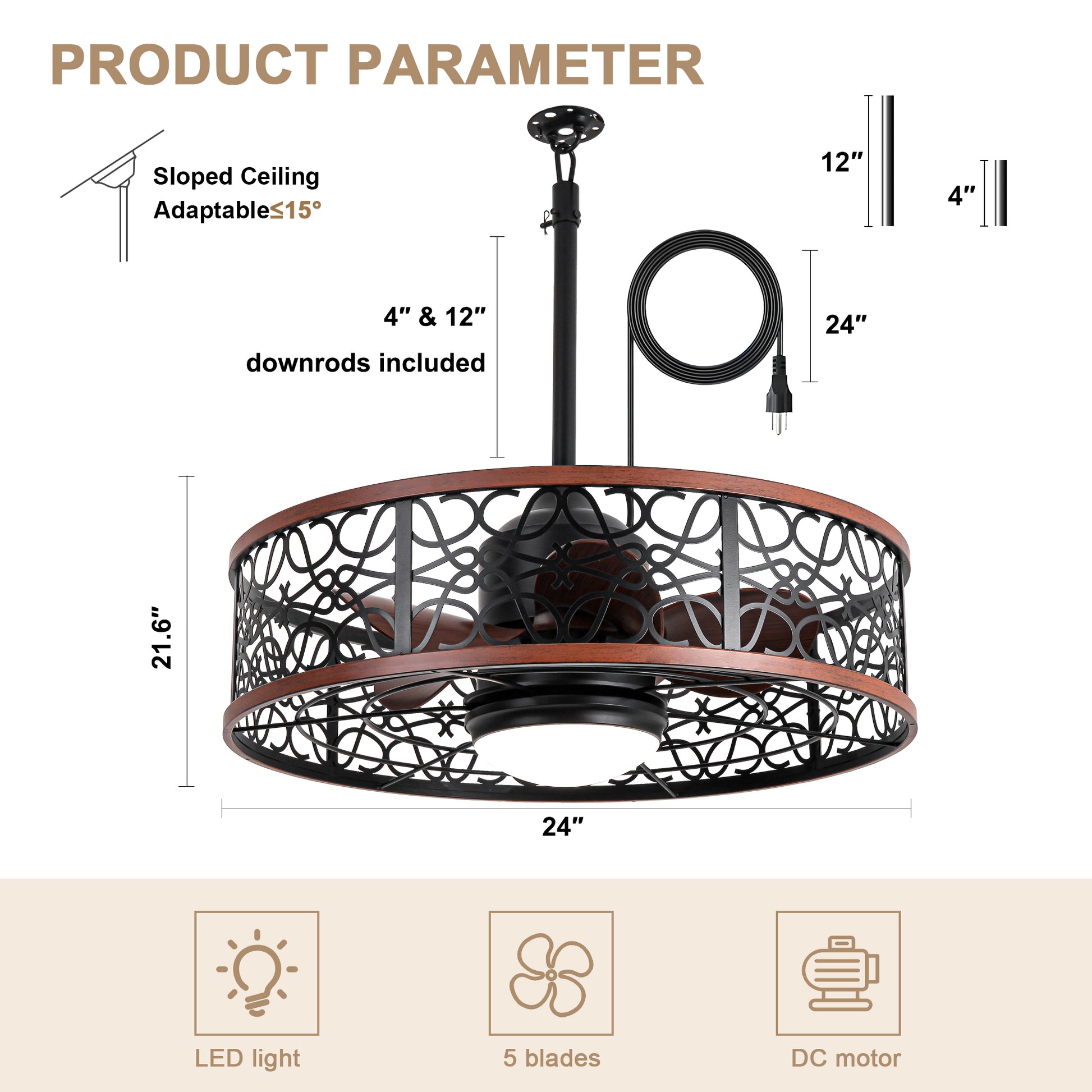 HW2310-GED-BellaDepot 24" Outdoor Iron Carving Caged Ceiling Fan with Remote Control, DC Motor 6 Speeds Fan with LED Lights